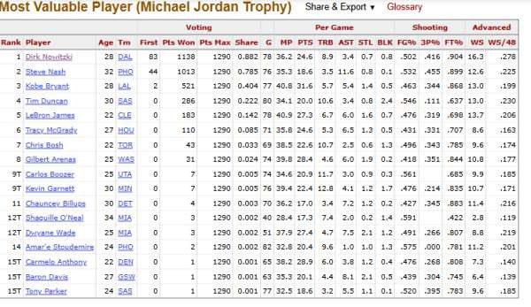 此外,诺维斯基21年生涯中,有12个赛季位列MVP榜单前十五。
